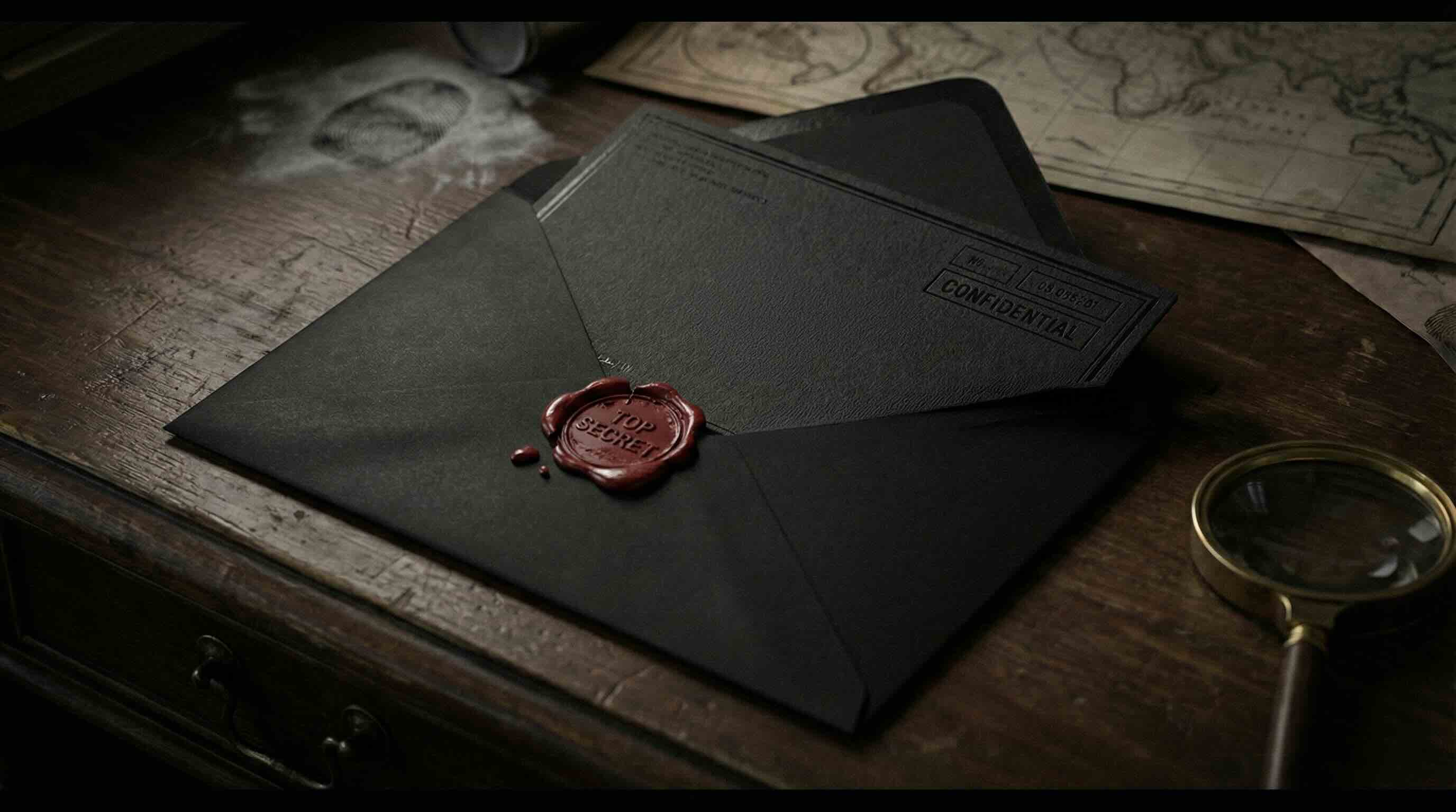 Schwere, edle Karte im schwarzen „Top-Secret"-Umschlag. Innen: eine Einsatzorder, die sich anfühlt wie der erste Funkspruch. Du überreichst keine Zahlung – du überreichst eine Mission.